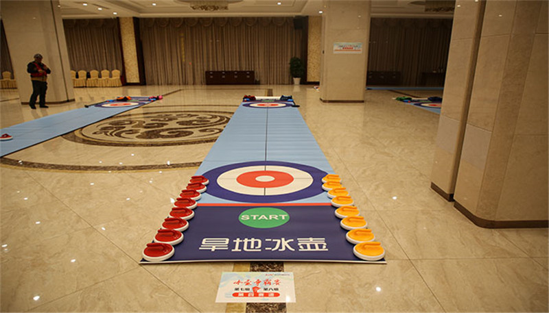 在賽道兩邊分別放置兩種不同顏色的地壺球各8個。參賽隊員分成兩隊,可根據人員調整。從賽道的一端發球,用手將球向前推,兩隊交替投球,投擲后看場上兩個隊離圓心遠近決定得分情況。